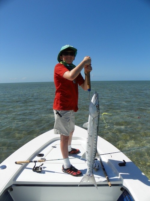 Malcolm and I spent the day entertaining his 9year old twin sons, George and Malcolm. They started the day off by each catching their first bonefish. Next they each caught big barracuda. Next they each caught 80lb. plus Lemon sharks. They topped the day off by each catching their first bonehead sharks and several jacks...