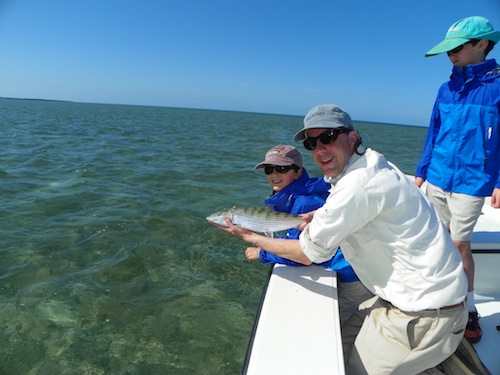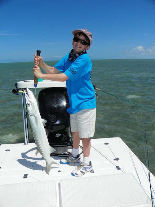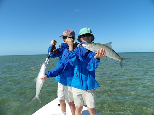 Malcolm and I spent the day entertaining his 9year old twin sons, George and Malcolm. They started the day off by each catching their first bonefish. Next they each caught big barracuda. Next they each caught 80lb. plus Lemon sharks. They topped the day off by each catching their first bonehead sharks and several jacks...