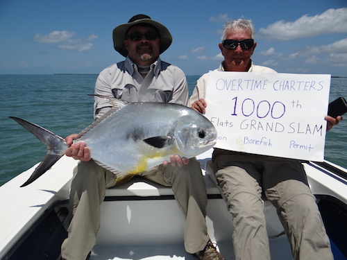 Jan and Jeff started the day off each catching tarpon. Next they teamed up to catch 5 bonefish. Jeff topped the day off catching a permit giving him a Grand Slam and OVERTIME Charters it's 1000 th Grand Slam!